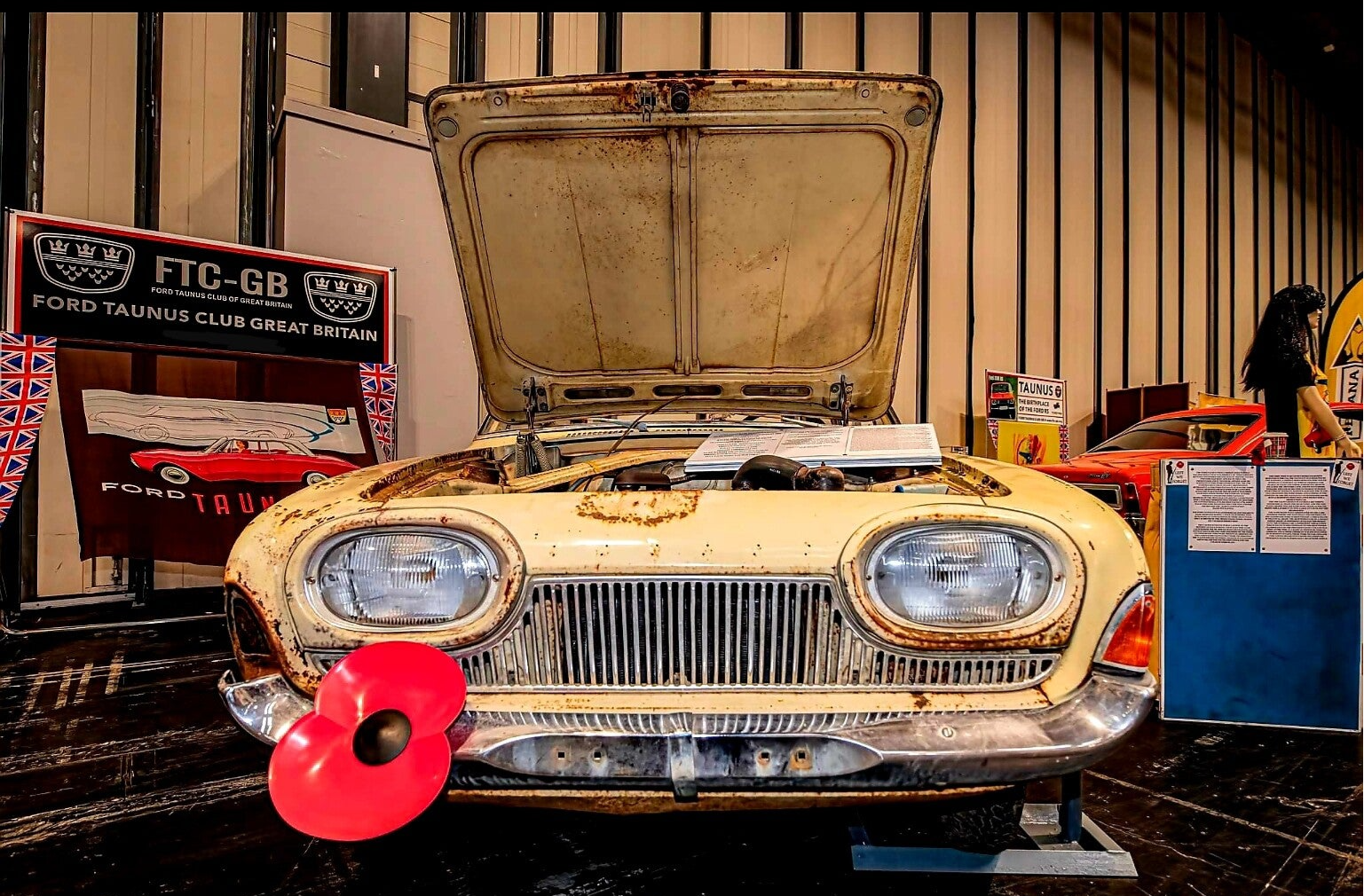 Manufactured by Melsoms of Birmingham, and so i struck a deal to buy a large quantity and proceeded to sell them to Clubs and individuals across Europe. It was a mad idea, but by December 2022 i had raised all of the funds needed for the 2023 NEC Show!!! And quite early on in 2023, i was contacted by a (non FB) user Pete Goodman who had bought and saved a 1963 P3 17m Super from being scrapped!! brave man. And could i help him? So during the months ahead, i guided him through the lengthy process of registering the Swedish P3 with the UK...DVLA. His enthusiasm was infectious for the restoration of the P3, so much so i invited him to the November Show this year. I also invited an accomplished photographer and friend Paul Andrew Kitchen (Kitch) to be with us all weekend brandishing his brace of Nikons who on his first visit found it very worthwhile and enjoyable capturing some super pics of our stand and other exhibits. (See Photo). With the Stand being compromised to a degree we had a two car stand ,with my 2021 Show Award Winning 20M RS again transporting all the Stand equipment too! Always and with trepidation travelling to the Show over 100 miles from home, crammed full of everything to set up the FTC-GB Stand and equipment. And setting up too assembling everything the previous day Thursday for the publics admittance on Friday at 10.00am. Its become the norm now it seems for Hall 8 to be the "Ford Destination" for Ford Fans with 40+ Clubs with Stands in there. And on opening day Pete's P3 the likes of which have never been seen at the show before ,proving a very popular exhibit on the FTC-GB stand all weekend. And to promote Pete's P3 Restoration Project, I commissioned a Special ...T...Shirt for him adding another dimension to the Stand also. The popular phrase heard many times, "Its a Ford, never seen one before!??" The Stand we have at the NEC is niche among the many Clubs, as many Clubs are there with the same make of cars. While our Ford Stand is totally unique at the NEC Show and ours being a destination for many Ford Fans looking forward to seeing our FTC-GB layout often with a Ford Model never seen before!!